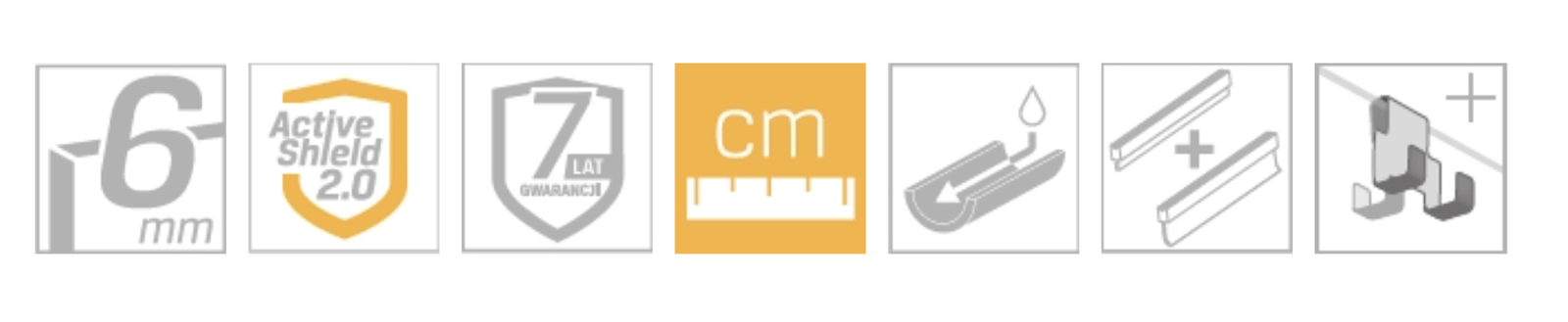 - Kabinoje sumontuotas saugus, 6 mm storio grūdintas stiklas su Active Shield 2.0 apsaugine danga (apsaugo nuo kalkių nuosėdų).