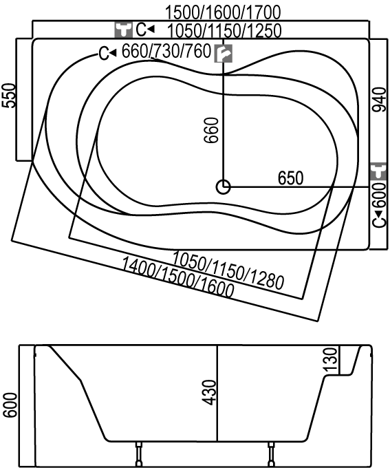 Išmatavimai: 1700 mm x 930 mm x 550 mm