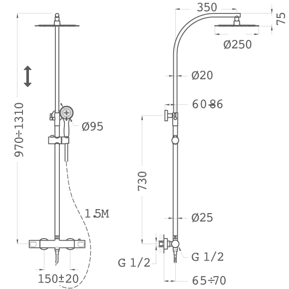 - Apvalus, reguliuojamas teleskopinis dušo galvos laikiklis: