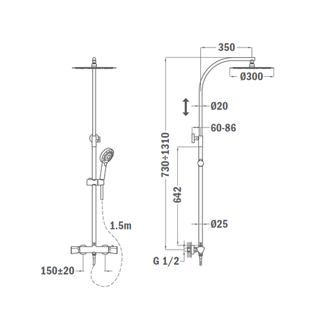 - Reguliuojamas teleskopinis stacionarios dušo galvos laikiklis: