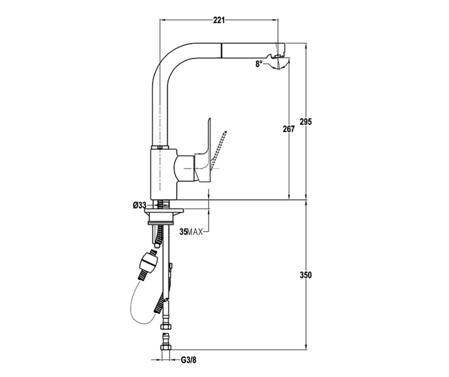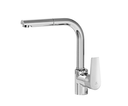 - Pasukamas aukštas, lenktas čiaupas su ištraukiamu, lanksčiu, metaliniu dušeliu