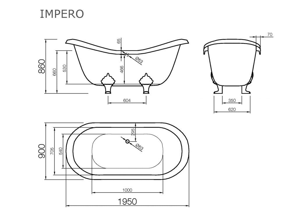 Akmens masės vonia Impero 1950 mm ilgio, be kojų ir be sifono