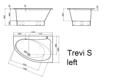 Akmens masės vonia TREVI S LEFT, 1400 mm ilgio, be sifono